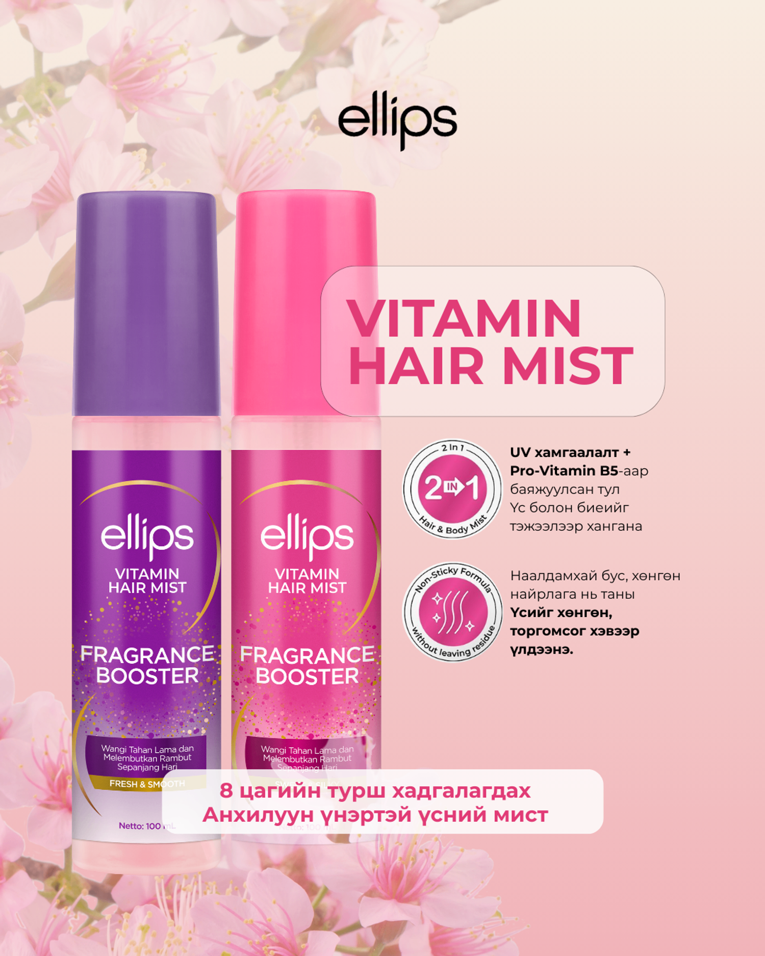 Үсээ хүссэн үедээ, хаана ч шууд цацаж, анхилуун үнэр бий болгож, эрүүл, гялалзан байдлаа хадгаалаарай.